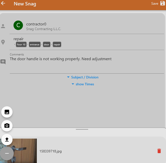 Optionally, you can add a division and a subject to the snag by clicking the Subject / Division link.