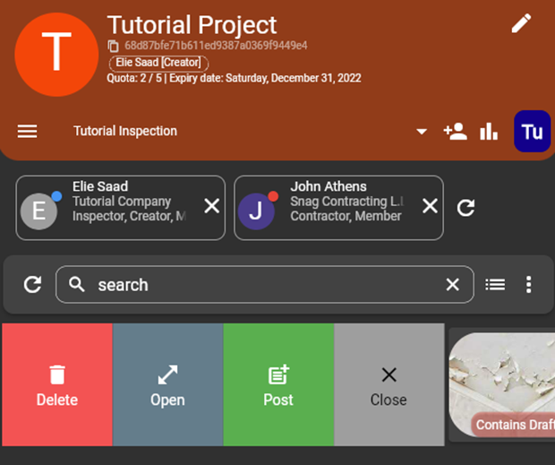Having a project, inspection visit and members, you can now start collecting snags. Or you can add new inspectors to the visit and have them collect snags as well.